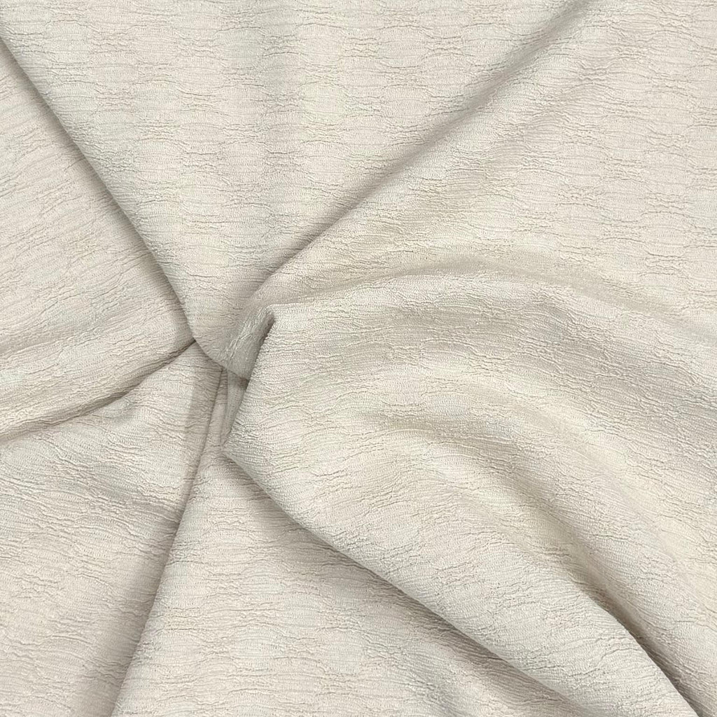 Textured crepe jersey is a soft, stretchable knit fabric that combines the comfort of jersey with the refined surface of crepe. It is characterized by a slightly crinkled or pebbled texture, giving it a matte, elegant look while still being lightweight and flexible. The fabric drapes beautifully, offers ease of movement, and retains its shape well, making it ideal for dresses, blouses, skirts, and eveningwear. Because it balances texture with stretch, textured crepe jersey provides both style and comfort, lending garments a polished yet relaxed appearance suitable for both casual and formal occasions.